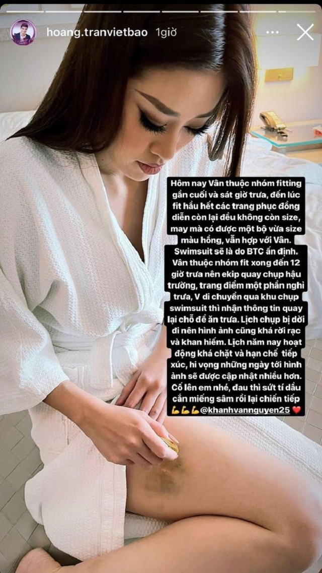 Mới đây, một thành viên trong ekip của nàng hậu đã đăng tải bức ảnh Khánh Vân đang ngồi tự lau vết thương bầm tím trên đùi khiến fan vô cùng xót xa. Dù không hé lộ nguyên nhân bị thương nhưng chỉ nhìn qua cũng có thể thấy nét mệt mỏi đang lộ rõ trên gương mặt nàng hậu.