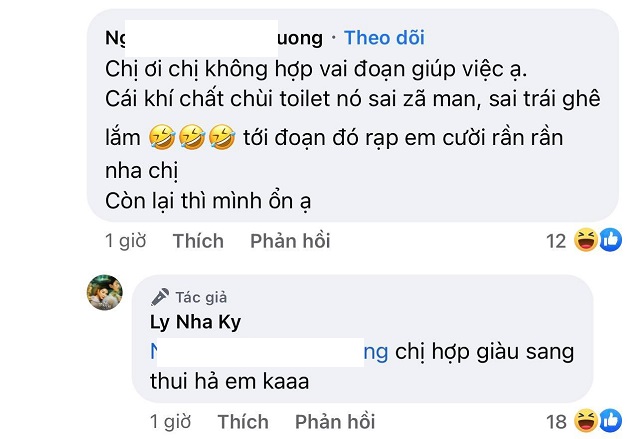 Dưới phần bình luận, ngoài những lời động viên của khán giả, 1 cư dân mạng đã ra rạp xem phim thẳng thắn nhận xét: "Chị ơi chị không hợp vai đoạn giúp việc ạ. Cái khí chất chùi toilet nó sai dã man, sai trái ghê lắm, tới đoạn đó rạp em cười rần rần nha chị. Còn lại thì mình ổn ạ". Trước sự trêu chọc của khán giả, Lý Nhã Kỳ thích thú đáp lại: "Chị hợp giàu sang thui hả em".