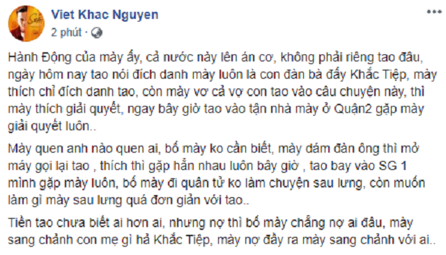 Ồn ào giữa ông bầu Vũ Khắc Tiệp và ca sĩ Khắc Việt những ngày qua gây xôn xao CĐM. Nguyên nhân là trong 1 bài phỏng vấn với truyền thông, bạn thân Ngọc Trinh đã đề cập đến chuyện bị Khắc Việt "đá xéo" là "thằng đàn bà" trên MXH. Khắc Việt ngay sau khi đọc được thông tin này đã rần rần thách thức Vũ Khắc Tiệp, yêu cầu đòi gặp mặt "tính sổ". Tuy nhiên, nam ca sĩ đã nhanh chóng xóa tus và tìm hướng giải quyết văn minh hơn.