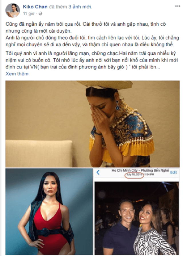 Khác với Trương Ngọc Ánh, Kiki Chan là người tình chưa bao giờ được Kim Lý thừa nhận. Mọi tin đồn tình cảm với Kim Lý đều do chính cô tung ra. Cụ thể, Kiko Chan từng chia sẻ dòng trạng thái tự kể về mối tình với Kim Lý khiến ai cũng bất ngờ. Cô khẳng định chính nam diễn viên là người đã chủ động theo đuổi và gặp gỡ cô trong 2 năm trước.
