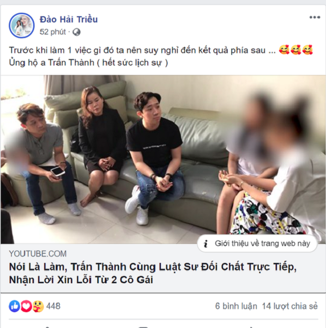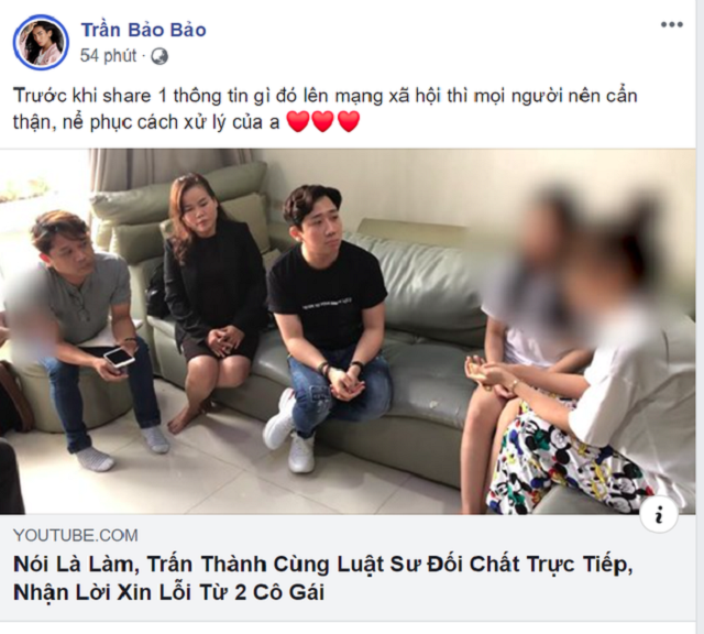 Đáng chú ý nhất là phản ứng của Hari Won. Bà xã Trấn Thành đăng tải dòng trạng thái ẩn ý: "Mình làm người ta phiền thì đó là vô tình? Nói chung làm gì làm. Làm ơn hãy đặt vào vị trí ngược lại. Vậy sẽ có đáp án...". Dù không nói trực tiếp nhưng người đọc đều có thể hiểu rằng nữ ca sĩ đang bức xúc trước hành động của hai cô gái đăng tin sai sự thật về ông xã của mình. Cô cũng nhắn nhủ rằng hãy đặt mình vào vị trí người khác để có cách hành xử đúng mực và không làm ảnh hưởng đến người khác.