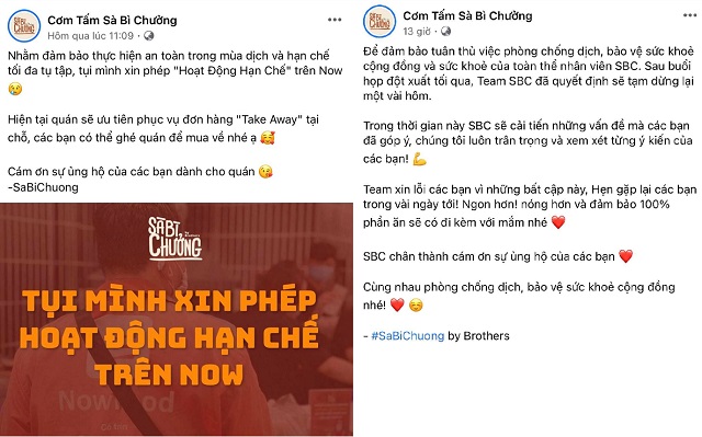 Tuy nhiên, vừa mở hàng không bao lâu thì quán cơm của bộ 3 lại gặp sự cố và phải ngưng hoạt động. Trên trang fanpage của quán đăng tải dòng thông báo: "Để đảm bảo tuân thủ việc phòng chống dịch, bảo vệ sức khoẻ cộng đồng và sức khoẻ của toàn thể nhân viên SBC. Sau buổi họp đột xuất tối qua, Team SBC đã quyết định sẽ tạm dừng lại một vài hôm".