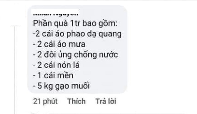 Không những vậy, còn có người tiết lộ danh sách phần quà trị giá 1 triệu đồng của Hoài Linh, bao gồm: 2 áo phao dạ quang, 2 áo mưa, 2 đôi ủng, 2 nón lá, 1 mền và 5 kg gạo. Nhiều cư dân mạng cho rằng những món quà của nam danh hài ở thời điểm hiện tại là không cần thiết, người dân miền Trung giờ đã ổn định cuộc sống, thậm chí còn gửi đồ để hỗ trợ Bắc Giang chống dịch. Không ít người phẫn nộ khi cho rằng Hoài Linh chỉ đang cố giải ngân hết số tiền hơn 14 tỷ chứ không quan tâm đến việc người dân cần gì. Đồng thời, họ không quên chỉ trích sự "cứu trợ" muộn màng của nam nghệ sĩ cùng ekip chỉ khiến dân tình thêm bức xúc.