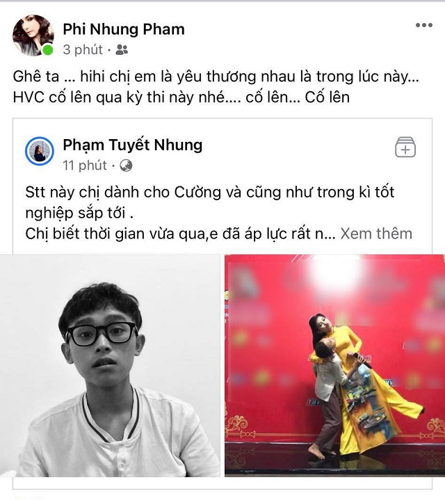 Phi Nhung sau đó cũng lập tức chia sẻ bài viết của con gái nuôi kèm dòng chú thích: “Chị em yêu thương nhau là trong lúc này, Hồ Văn Cường cố lên qua kỳ thi này nhé. Cố lên! Cố lên!”.