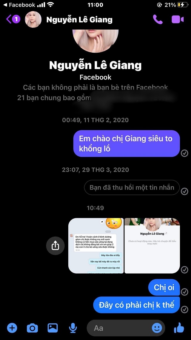 Theo đó, có người đã giả dạng tài khoản của Lê Giang, sau đó nhắn tin cho nhiều người xin tiền để tài trợ cho một người phụ nữ khó khăn mới sinh em bé, bị thiếu sữa. Nữ nghệ sĩ phủ nhận hoàn toàn mọi thông tin, khẳng định tài khoản này chỉ đang dùng tên tuổi của cô làm công cụ lừa tiền những ai nhẹ dạ cả tin.