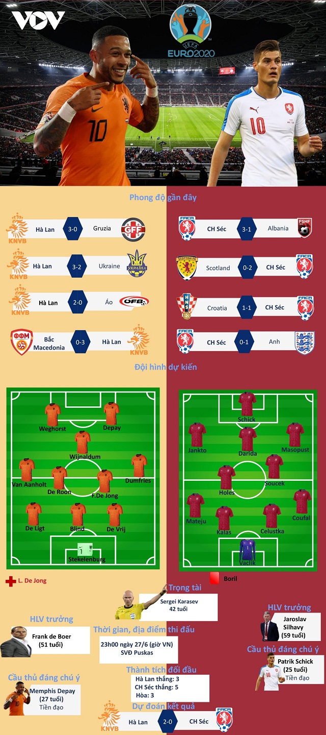 Vào lúc 23h00 tối 27/6 (giờ Việt Nam), trận đấu giữa Hà Lan và CH Séc sẽ diễn ra trong khuôn khổ vòng 1/8 EURO 2021.