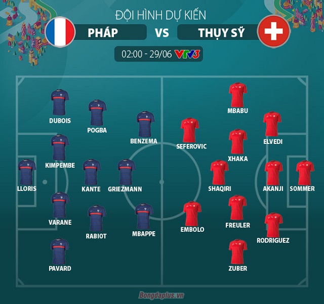 - Pháp: Lloris, Pavard, Varane, Kimpembe, Dubois, Pogba, Kante, Rabiot, Griezmann, Benzema, Mbappe.- Thụy Sỹ: Sommer, Elvedi, Akanji, Rodriguez, Mbabu, Xhaka, Freuler, Zuber, Shaqiri, Seferovic, Embolo.