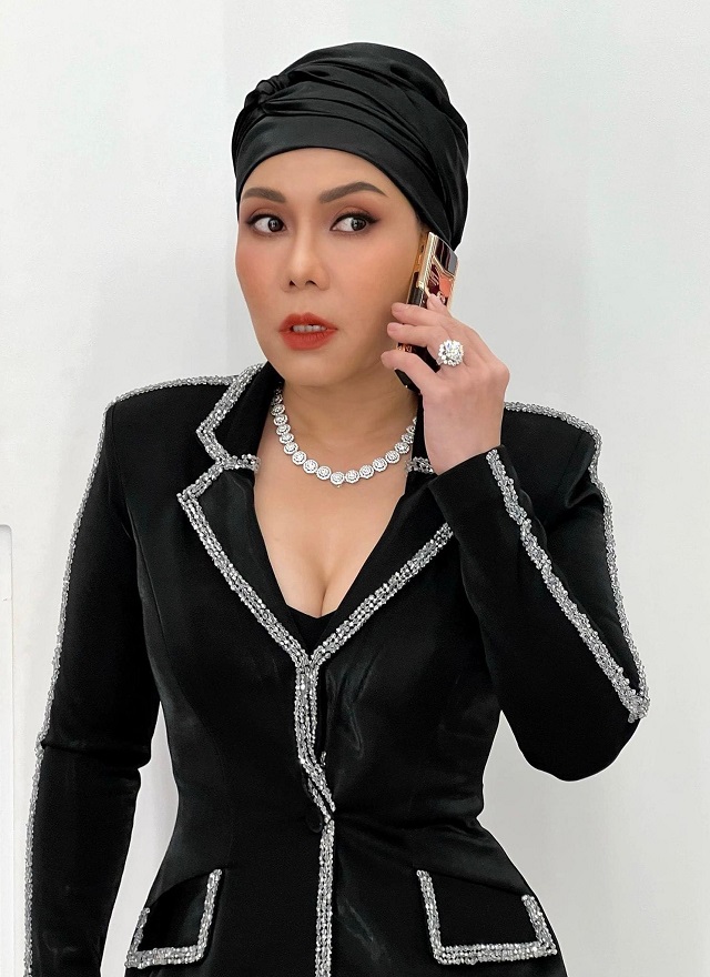 Dù đã cạo đi mái tóc của mình nhưng nhan sắc xinh đẹp của nữ danh hài không hề giảm sút mà thậm chí còn cá tính và cuốn hút hơn trước rất nhiều. Cô lựa chọn phụ kiện là chiếc khăn màu đen, quấn gọn đỉnh đầu che đi phần tóc bị cạo, kết hợp với đó là bộ vest cùng màu và thần thái "ngầu đét" khiến cho Việt Hương nhìn không khác gì "chị đại giang hồ". Dưới phần bình luận, khán giả dành lời khen ngợi cho nữ danh hài: