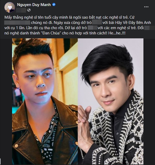 Duy Mạnh chửi thẳng mặt Đan Trường còn đặt biệt danh khó nghe, hóa ra là vì 'thâm thù' 10 năm trướcCu thể, trưa 9/6, giọng ca Kiếp Đỏ Đen đã có bài đăng cực gắt chỉ trích đàn em trên Facebook. Anh bức xúc: "Mấy thằng nghệ sĩ tên tuổi cậy mình là ngôi sao bắt nạt các nghệ sĩ trẻ. Cứ chửi **** *** ** chúng nó đi. Ngày xưa cũng dở trò **** với bài Hãy Về Đây Bên Anh với cụ 1 lần. Lần đó cụ tha cho rồi. Giờ lại dở trò **** với các em nghệ sĩ trẻ. Đổi ** nó nghệ danh thành “Đan Chùa” cho nó hợp với tính cách! Hehe".