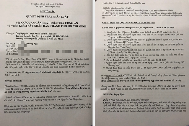 Dựa vào cơ sở đó, Phương Nga cho rằng CQĐT và Viện KSND TP.HCM đã ra lệnh khởi tố trái phép, không tuân theo BLHS năm 2015 đang có hiệu lực. Đồng thời, cô cũng cho rằng cơ quan CSĐT đã ra kết luận điều tra, xác định lý do và căn cứ đình chỉ vụ án làm giả con dấu trước, rồi mới khởi tố chính vụ án đó.