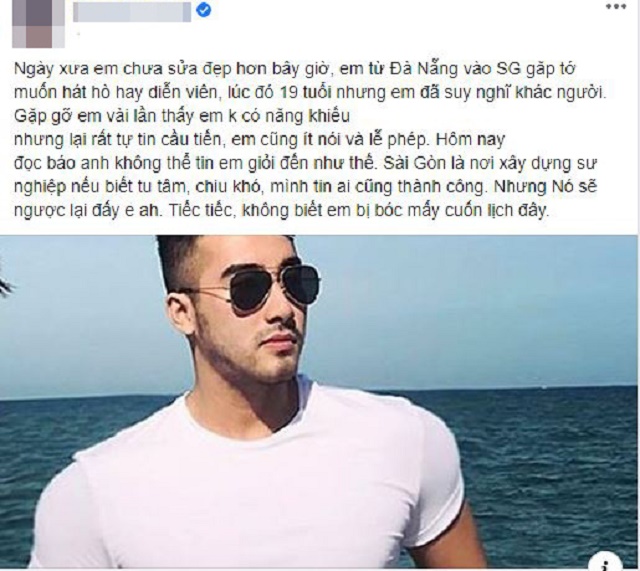 Nguyên văn dòng chia sẻ của quản lý Quang Hà: "Ngày xưa em chưa sửa đẹp hơn bây giờ. Em từ Đà Nẵng vào Sài Gòn gặp tớ, muốn hát hò hay diễn viên, lúc đó 19 tuổi nhưng em đã suy nghĩ khác người. Gặp gỡ em vài lần, thấy em không có năng khiếu nhưng lại rất tự tin, cầu tiến, em cũng ít nói và lễ phép. Hôm nay đọc báo, anh không thể tin em giỏi đến như thế. Sài Gòn là nơi xây dựng sự nghiệp nếu biết tu tâm, chịu khó, mình tin ai cũng thành công. Nhưng nó sẽ ngược lại đấy em à. Tiếc tiếc, không biết em bị bóc mấy cuốn lịch đây?".