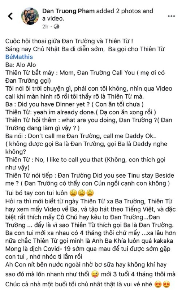 Cụ thể, khi gọi video call với con trai thì nam ca sĩ nhận được câu trả lời rằng: "Mom, Dan Truong call you" (mẹ ơi có Đan Trường gọi)". Giọng ca Chim trắng mồ côi vô cùng bất ngờ khi Thiên Từ hằng ngày ngoan ngoãn là thế mà nhất quyết không gọi mình là bố.