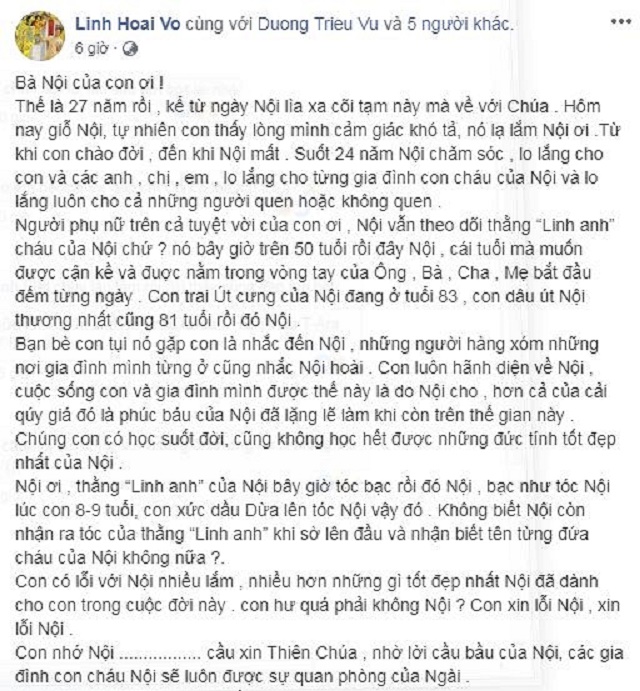 Nguyên văn bài viết của danh hài Hoài Linh: "Bà nội của con ơi! Thế là 27 năm rồi, kể từ ngày Nội lìa xa cõi tạm này mà về với Chúa. Hôm nay giỗ Nội, tự nhiên con thấy lòng mình cảm giác khó tả, nó lạ lắm Nội ơi. Từ khi con chào đời, đến khi Nội mất. Suốt 24 năm Nội chăm sóc, lo lắng cho con và các anh, chị, em lo lắng cho từng gia đình con cháu của Nội và lo lắng luôn cho cả những người quen hoặc không quen. Người phụ nữ trên cả tuyệt vời của con ơi, Nội vẫn theo dõi thằng 'Linh anh' cháu của Nội chứ? Nó bây giờ trên 50 tuổi rồi đây Nội, cái tuổi mà muốn được cận kề và được nằm trong vòng tay của Ông, Bà, Cha, Mẹ bắt đầu đếm từng ngày. Con trai Út cưng của Nội đang ở tuổi 83, con dâu út Nội thương nhất cũng 81 tuổi rồi đó Nội.