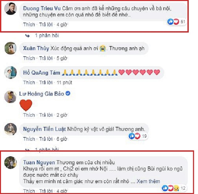 Em trai ruột của nam danh hài là ca sĩ Dương Triệu Vũ cũng nhắn nhủ: "Cảm ơn anh đã kể những câu chuyện về bà nội, những chuyện em còn quá nhỏ để biết để nhớ".