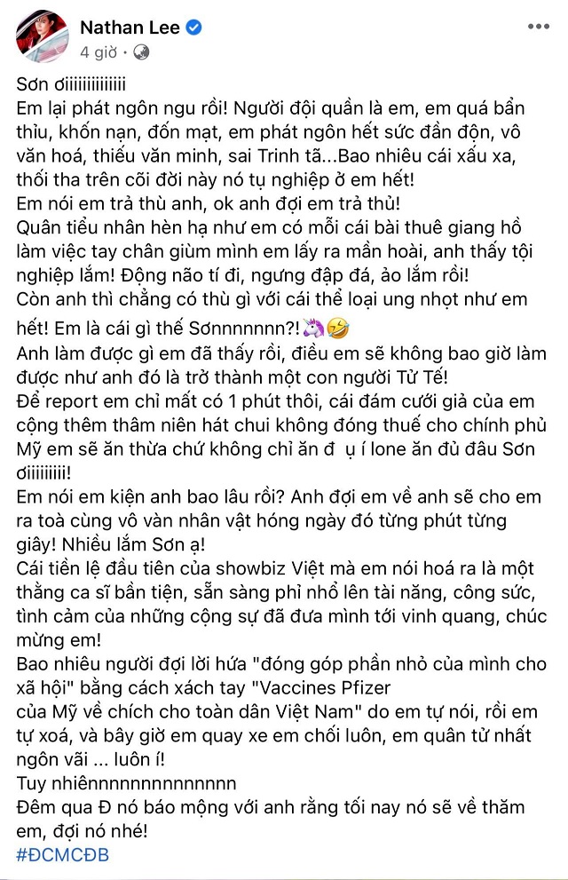 Trước phản ứng gay gắt của Cao Thái Sơn, Nathan Lee lập tức đáp trả bằng dòng trạng thái đầy mỉa mai. Nam ca sĩ mắng thẳng mặt Cao Thái Sơn là "quá bẩn thỉu, khốn nạn, đốn mạt" và phát ngôn thì "vô văn hóa, thiếu văn minh và sai Trinh tã (chính tả)". Anh cho biết bản thân sẵn sàng đợi Cao Thái Sơn trả thù và ẩn ý sẽ vạch trần chuyện nam ca sĩ kết hôn giả, trốn thuế. Giọng ca Xinh cũng không quên nhắc lại vụ việc nam ca sĩ chối bay chối biến chuyện đóng góp cho xã hội bằng việc "xách tay Vaccines Pfizer" từ Mỹ về Việt Nam.