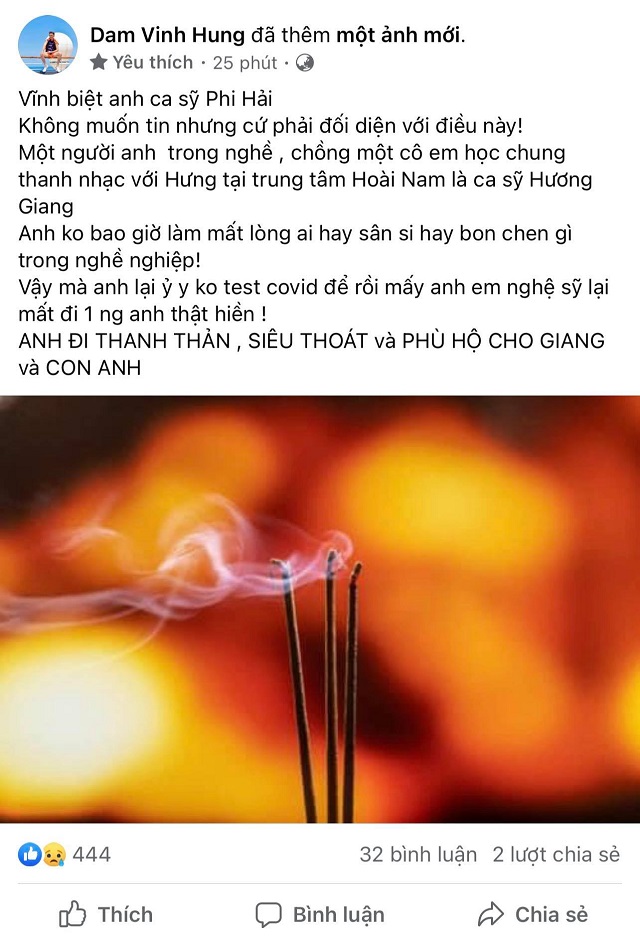 Theo đó, ca sĩ Phi Hải là chồng của ca sĩ Hương Giang - 1 người em từng học chung thanh nhạc với giọng ca Lâu Đài Cát. Nam ca sĩ đột ngột qua đời vì covid-19 khiến cho "ông hoàng nhạc Việt" không khỏi xót xa. Ânh bày tỏ nỗi tiếc thương trước sự ra đi của đàn anh, cầu nguyện cho anh và gia đình.
