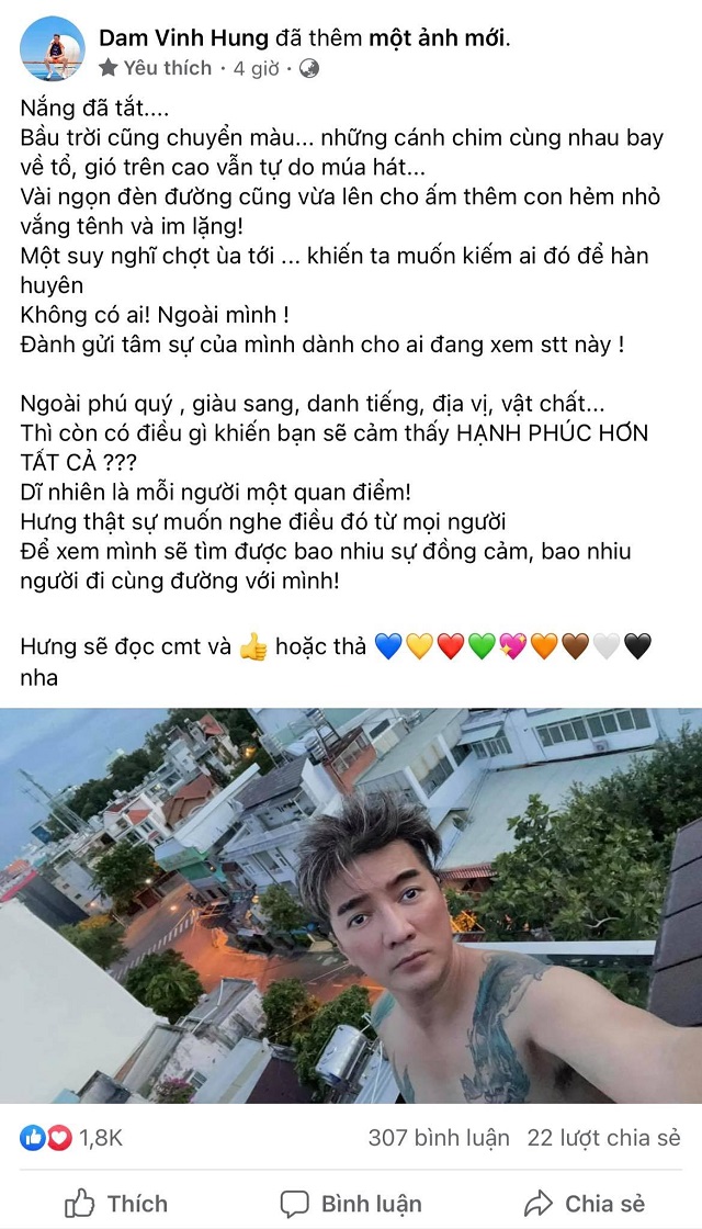Mới đây, trên trang Facebook cá nhân, Đàm Vĩnh Hưng đã có chia sẻ khá dài, chất chứa đầy tâm trạng: