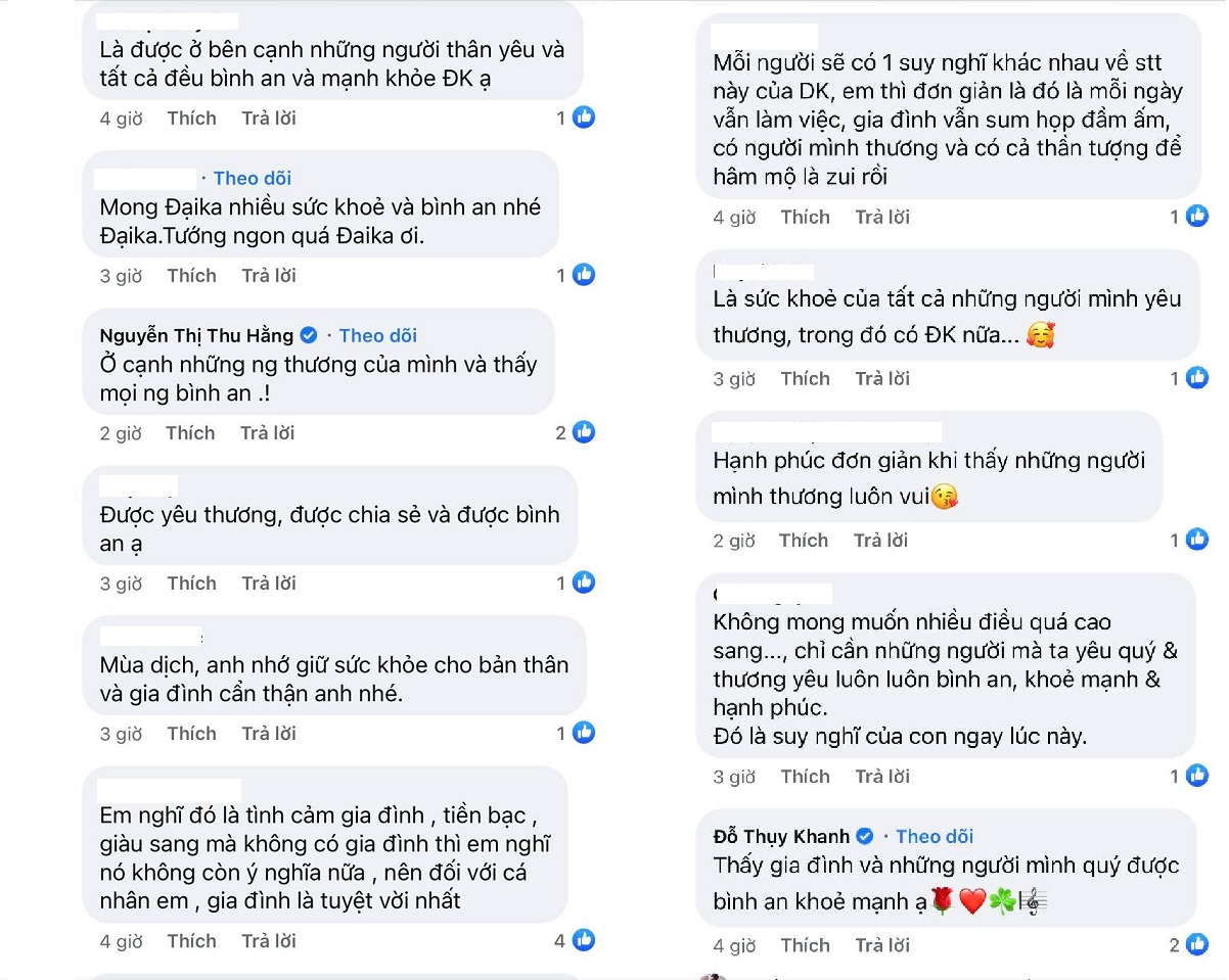 -Không mong muốn nhiều điều quá cao sang chỉ cần những người mà ta yêu quý & thương yêu luôn luôn bình an, khoẻ mạnh & hạnh phúc. Đó là suy nghĩ của con ngay lúc này.