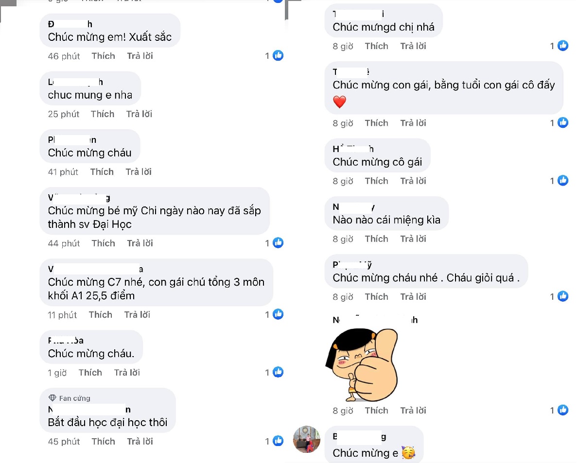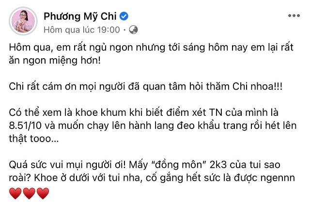 Theo đó, dù nhiều lần than thở làm sai những câu cơ bản trong kì thi tốt nghiệp thì tối qua cô bé đã biết được điểm thi của mình. Được biết, năm nay điểm tốt nghiệp của các sĩ tử quy về thang điểm 10, bao gồm 70% điểm thi THPT và 30% điểm trung bình lớp 12. 8.51 là số điểm khá cao và tất nhiên là "dư sức" để tốt nghiệp rồi!. Với kết quả như vậy, có thể thấy Phương Mỹ Chi đã bỏ không ít công sức cũng như thời gian cho việc học, không hề bỏ bê để chạy show như những lời đồn trước đó. Bên dưới phần bình luận, không ít cư dân mạng bày tỏ niềm vui, gửi lời chúc mừng đến Phương Mỹ Chi.