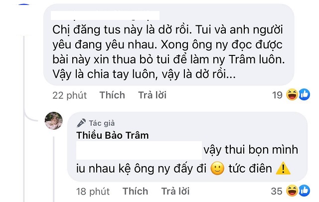 Đáng chú ý, dưới phần bình luận, khi có người than thở: "Chị đăng tus này là dở rồi. Tui và anh người yêu đang yêu nhau. Xong ông người yêu đọc được bài này xin thua bỏ tui để làm người yêu Trâm luôn. Vậy là chia tay luôn, vậy là dở rồi...". Giọng ca Triệu Lý Do liền đáp lại: "Vậy thui bọn mình yêu nhau kệ ông người yêu đấy đi. Tức điên". Thái độ gay gắt của Thiều Bảo Trâm khi gặp phải "tra nam" trong truyền thuyết khiến dân tình khá bất ngờ. Liệu có phải giọng ca sinh năm 1994 đã từng rơi vào trường hợp tương tự?
