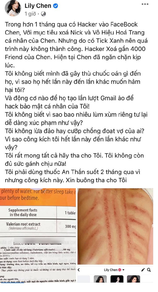 Nữ ca sĩ tỏ ra vô cùng bức xúc khi bị hacker liên tục quấy rối, muốn hack trang cá nhân của cô. Không những thế, người đẹp còn khiến dân tình xót xa khi tiết lộ phải uống thuốc an thần suốt 2 tháng qua, chỉ mong được buông tha vì đã quá mệt mỏi. Đáng chú ý, hình ảnh tấm lưng rướm máu của Lily Chen cũng khiến CĐM 1 phen hoảng hồn, lo lắng cho cô.