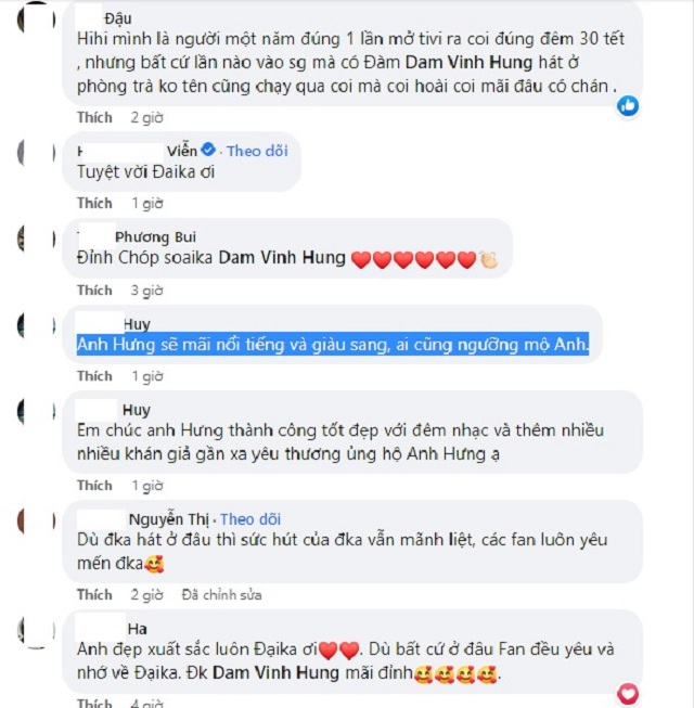 Dưới phần bình luận, người hâm mộ tự hào, liên tục bày tỏ tình cảm với Đàm Vĩnh Hưng: