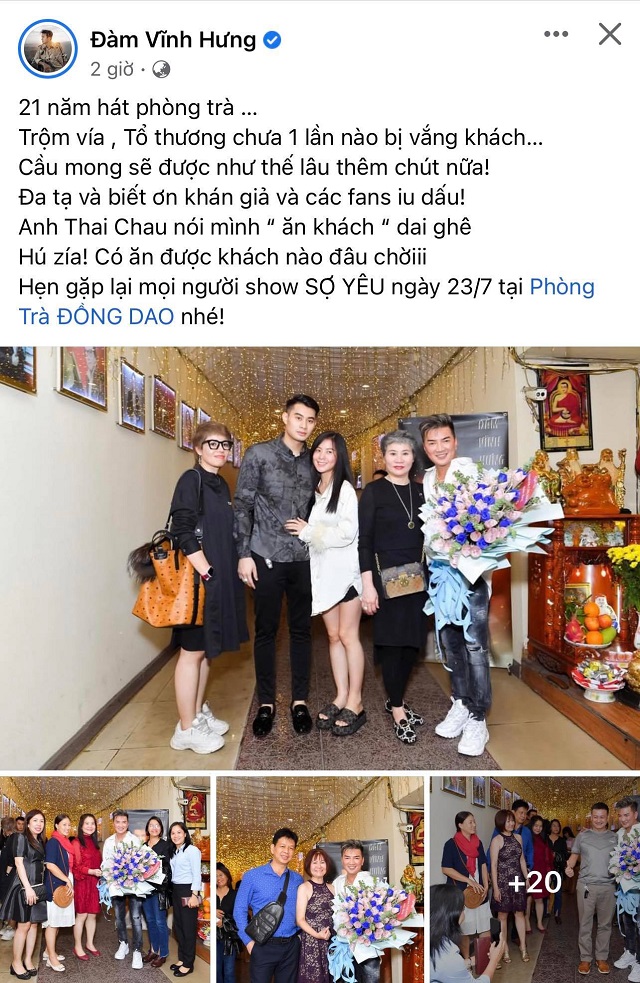 Theo đó, giọng ca Lâu Đài Tình Ái tự hào khi khoe với khán giả về hành trình 21 năm đi hát chưa biết "ế show" là gì. Nếu theo dõi nam ca sĩ thường xuyên sẽ thấy, ngay cả thời điểm dính scandal với bà Nguyễn Phương Hằng thì Mr. Đàm vẫn đắt show, liên tục đi diễn tại các phòng trà, chương trình lớn nhỏ cả trong và ngoài nước. Dù có nhiều antifans luôn "nhiệt tình" chỉ trích, tẩy chay Đàm Vĩnh Hưng nhưng cũng có không ít fan hâm mộ sẵn sàng đứng ra bảo vệ, ủng hộ anh hết mình. Độ hot bền bỉ của nam ca sĩ khiến cho đàn anh trong nghề cũng phải thốt lên là anh "ăn khách" quá dai!