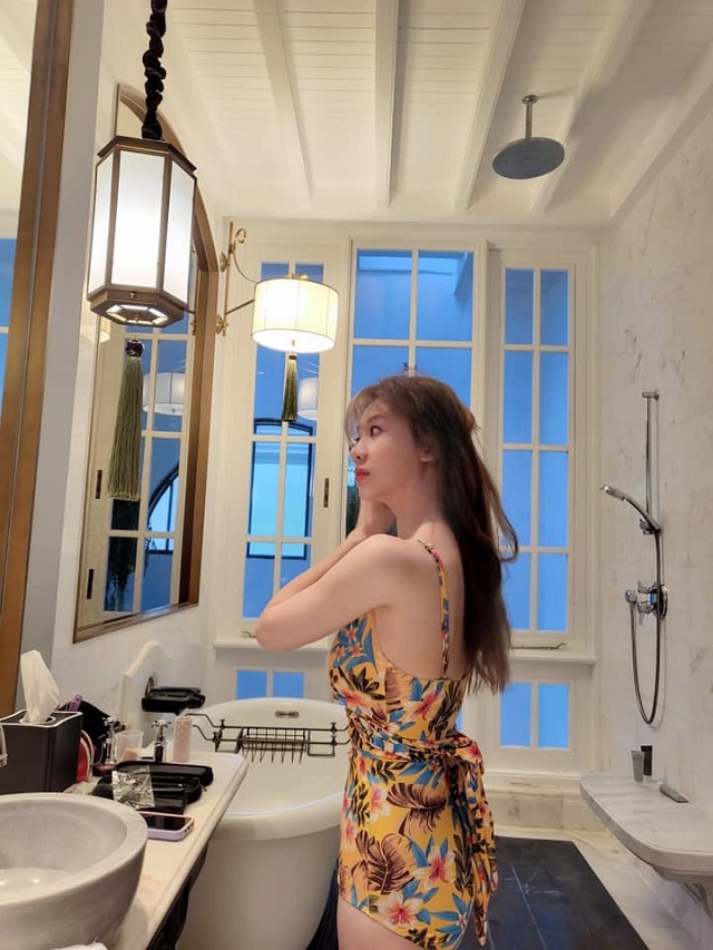 Mới đây, trên trang Facebook cá nhân, giọng ca sinh năm 1985 chia sẻ hình ảnh chuẩn bị đi bơi kèm caption: "Chuẩn bị đi bơi thì bão tới mưa rầm rầm. Ủa?! Dì dạ?!?!".