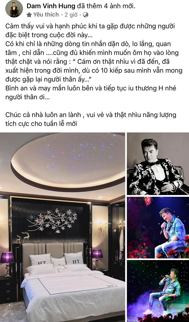 Sáng 11/7, trên trang Facebook cá nhân, Đàm Vĩnh Hưng chia sẻ dòng trạng thái đầy xúc động. Anh viết: "Cảm thấy vui và hạnh phúc khi ta gặp được những người đặc biệt trong cuộc đời này… Có khi chỉ là những dòng tin nhắn dặn dò, lo lắng, quan tâm , chỉ dẫn ….cũng đủ khiến mình muốn ôm họ vào lòng thật chặt và nói rằng: “ Cám ơn thật nhìu vì đã đến, đã xuất hiện trong đời mình, dù có 10 kiếp sau mình vẫn mong được gặp lại người thân ấy…”. Bình an và may mắn luôn bên và tiếp tục yêu thương Hưng nhé người thân ơi… Chúc cả nhà luôn an lành , vui vẻ và thật nhìu năng lượng tích cực cho tuần lễ mới".
