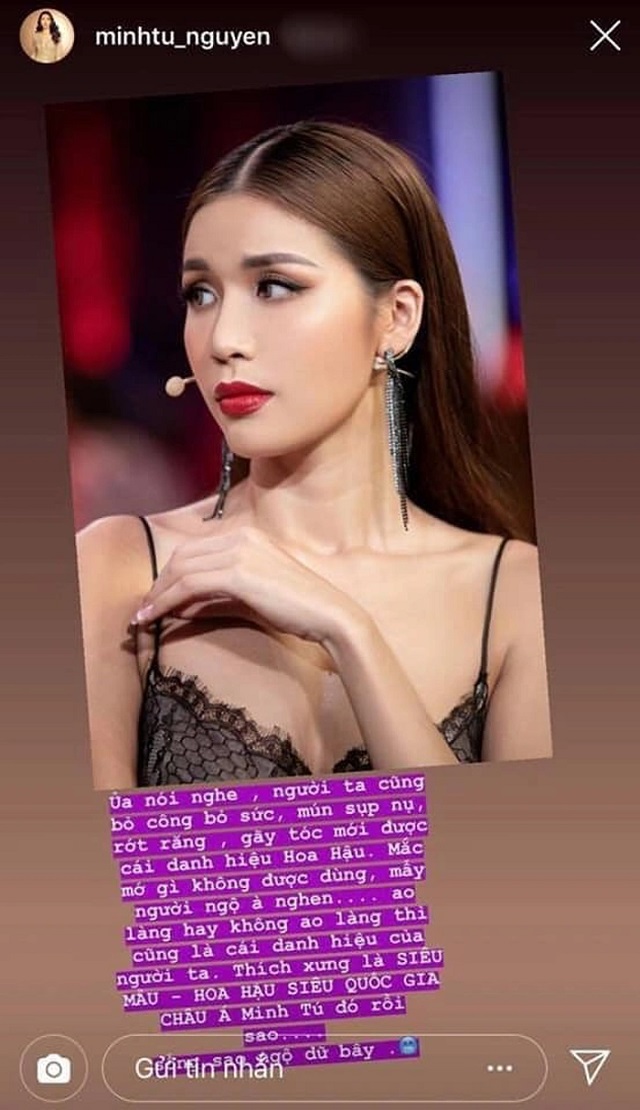 Trước những lời lẽ kém duyên như vậy, Minh Tú không "nhắm mắt làm ngơ" mà gay gắt đáp trả trong một bài đăng trên Instagram. Cô viết: "Người ta cũng bỏ công, bỏ sức rớt răng, gãy tóc mới có được danh hiệu hoa hậu mắc mớ gì không dùng. Ao làng hay không ao làng thì cũng là danh hiệu của người ta. Thích xưng là siêu mẫu - Hoa hậu siêu quốc gia châu Á đó rồi sao".