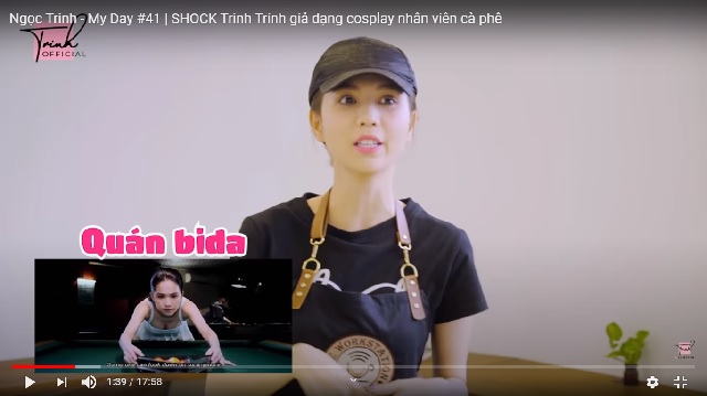 Hóa ra đây là clip Ngọc Trinh dàn dựng, cosplay nhân viên phục vụ để trải nghiệm một ngày làm việc tại quán cà phê. Ở phần đầu video, Ngọc Trinh đội sụp mũ, đóng vai nhân viên order. Có vẻ như có một vài người đã nhận ra và đưa điện thoại lên khiến "nữ hoàng nội y" khá hoảng sợ.
