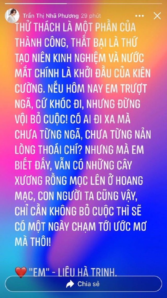 Đáng chú ý, mới đây, Nhã Phương khiến fan vô cùng lo lắng khi đăng đàn đầy tâm trạng trên story Facebook cá nhân. Cụ thể, bà xã Trường Giang viết: "Thử thách là một phần của thành công, thất bại là thứ tạo lên kinh nghiệm và nước mắt chính là khởi đầu của kiên cường. Nếu hôm nay em trượt ngã, cứ khóc đi, nhưng đừng vội bỏ cuộc! Có ai đi xa mà chưa từng ngã, chưa từng nản lòng thoái chí? Nhưng mà em biết đấy, vẫn có những cây xương rồng mọc lên ở hoang mạc, con người ta cũng vậy, chỉ cần không bỏ cuộc thì sẽ có một ngày chạm đến ước mơ mà thôi!"