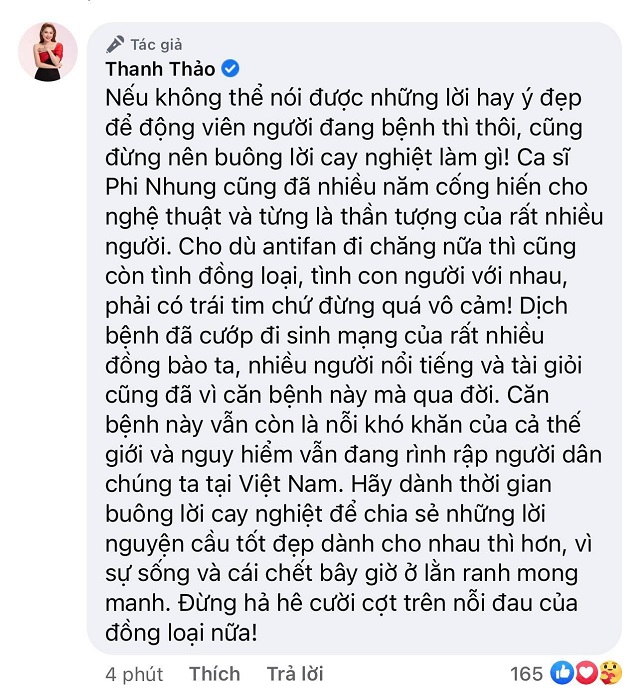 "Nếu không thể nói được những lời hay ý đẹp để động viên người đang bệnh thì thôi, cũng đừng nên buông lời cay nghiệt làm gì! Ca sĩ Phi Nhung cũng đã nhiều năm cống hiến cho nghệ thuật và từng là thần tượng của rất nhiều người. Cho dù antifan đi chăng nữa thì cũng còn tình đồng loại, tình con người với nhau, phải có trái tim chứ đừng quá vô cảm! Dịch bệnh đã cướp đi sinh mạng của rất nhiều đồng bào ta, nhiều người nổi tiếng và tài giỏi cũng đã vì căn bệnh này mà qua đời. Căn bệnh này vẫn còn là nỗi khó khăn của cả thế giới và nguy hiểm vẫn đang rình rập người dân chúng ta tại Việt Nam. Hãy dành thời gian buông lời cay nghiệt để chia sẻ những lời nguyện cầu tốt đẹp dành cho nhau thì hơn, vì sự sống và cái chết bây giờ ở lằn ranh mong manh. Đừng hả hê cười cợt trên nỗi đau của đồng loại nữa!".