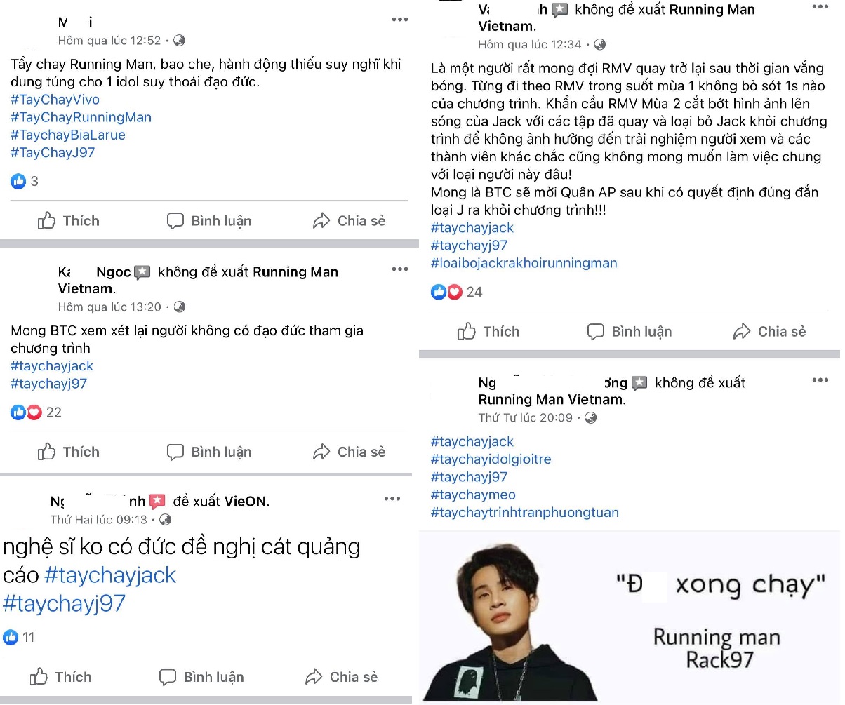 Chưa dừng lại, trên khắp các trang fanpage của những nhãn hàng nam ca sĩ đang đại diện cũng như gameshow có sự góp mặt của anh, rất nhiều cư dân mạng để lại bình luận phản đối gay gẳt kèm hastag #tẩychayJack. Chạy Đi Chờ Chi cũng bị "vạ lây" khi bị lôi lên khắp các "mặt trận online" với hastag #tẩychayrunningmanvietnam. Thêm nữa, tin đồn Jack chuẩn bị đi Hàn Quốc ghi hình cùng ekip chương trình vô tình trở thành "giọt nước trà ly", "thêm dầu" vào "ngọn lửa" phẫn nộ của khán giả.