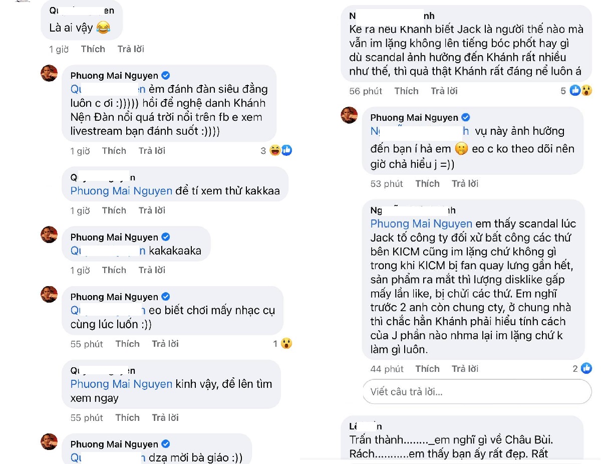 Thời gian qua, diễn viên Phương Mai bất ngờ nhận sự quan tâm lớn từ khán giả khi thẳng thắn nêu quan điểm về scandal của Jack. Theo đó, giữa lúc nam ca sĩ sinh năm 1997 liên tục bị bóc phốt chuyện lăng nhăng, có con, chỉ chu cấp 5 triệu mỗi tháng để nuôi con, Phương Mai không ngại bày tỏ sự bức xúc của cô trên trang cá nhân Facebook có hơn 100.000 người theo dõi.