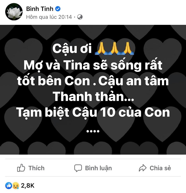 Mới đây, trên trang Facebook cá nhân, nghệ sĩ Bình Tinh bất ngờ thông báo tin tang sự: "Cậu ơi. Mợ và Tina sẽ sống rất tốt bên Con . Cậu an tâm Thanh thản... Tạm biệt Cậu 10 của Con ...."