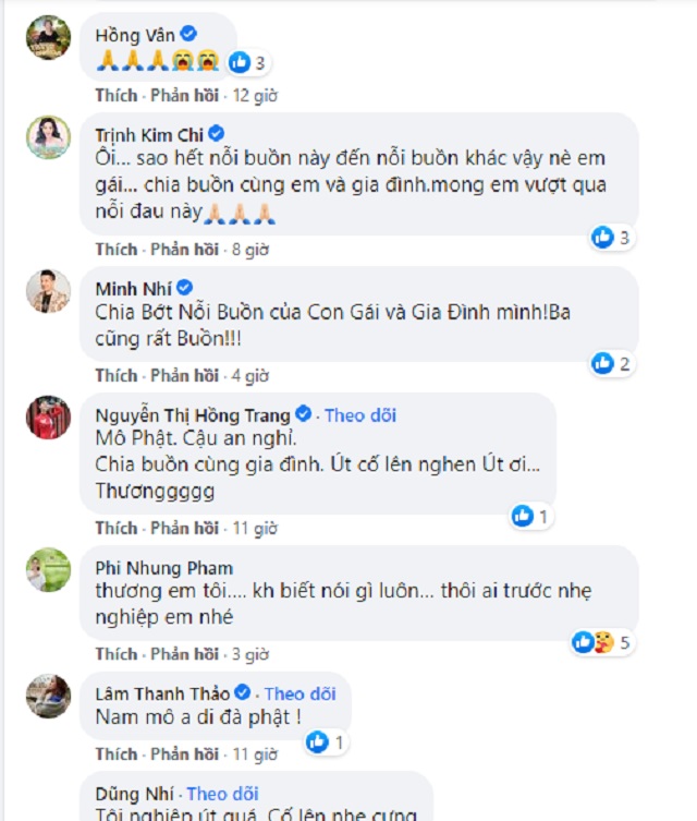 Nhận được tin buồn của đồng nghiệp, ca sĩ Phi Nhung an ủi: "Thương em tôi…. không biết nói gì luôn… Thôi ai trước nhẹ nghiệp em nhé"; Minh Nhí buồn bã: "Chia Bớt Nỗi Buồn của Con Gái và Gia Đình mình! Ba cũng rất Buồn!!!"; NSƯT Trịnh Kim Chi xót xa: "Ôi… sao hết nỗi buồn này đến nỗi buồn khác vậy nè em gái… chia buồn cùng em và gia đình.mong em vượt qua nỗi đau này";...