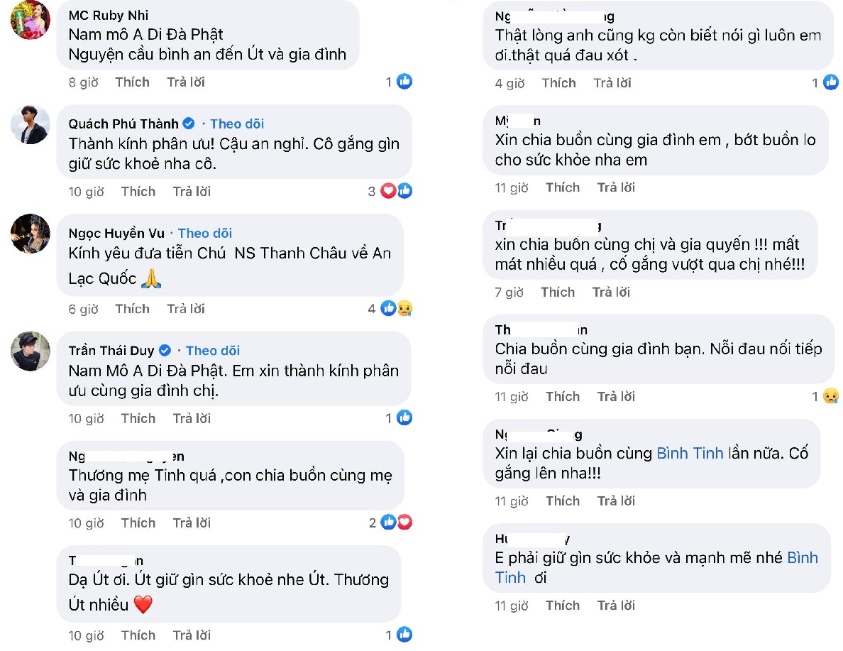 -Mô phật thành thật chia buồn cùng em và gia đình vì những mất mát trong mấy ngày qua. Cố gắng vượt qua và giữ gìn sức khỏe nhé em, cho ạnh chuyển lời chúc sức khỏe má Mai nha em.