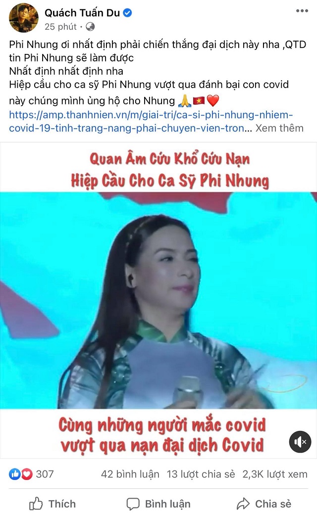 Nhận tin dữ từ đàn chị, một loạt sao Việt đã đăng tải trạng thái bày tỏ sự xót xa, cầu nguyện cho nữ ca sĩ vượt qua giai đoạn khó khăn này. Quách Tuấn Du thành tâm cầu nguyện: "Phi Nhung ơi nhất định phải chiến thắng đại dịch này nha, QTD tin Phi Nhung sẽ làm được. Nhất định nhất định nha. Hiệp cầu cho ca sỹ Phi Nhung vượt qua đánh bại con covid này chúng mình ủng hộ cho Nhung".