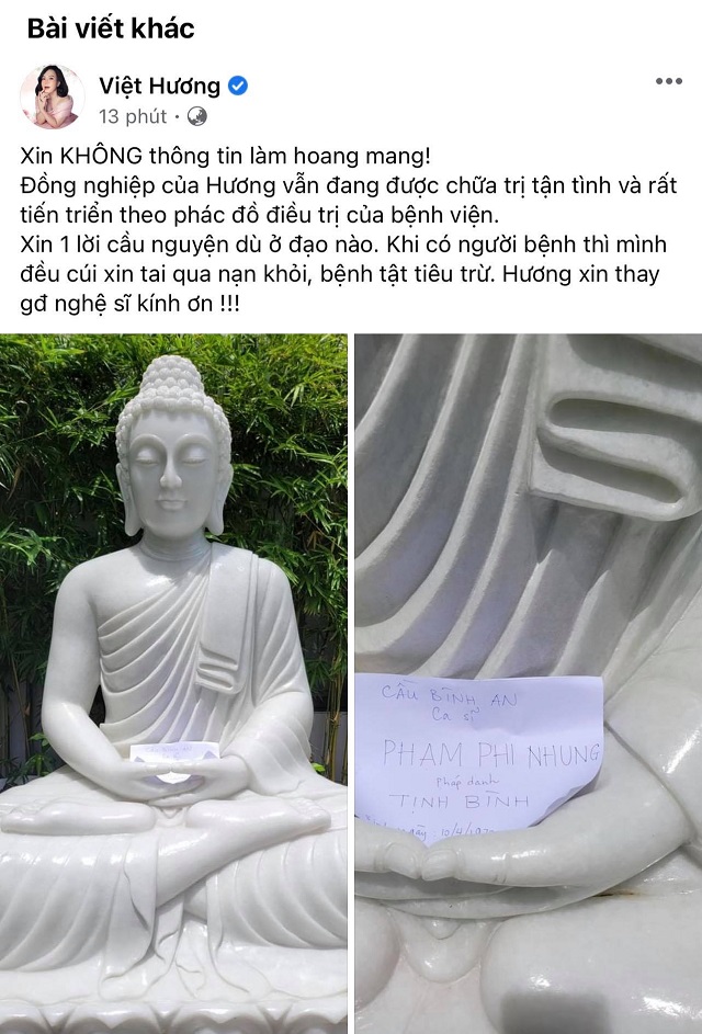 Mới đây, trên trang fanpage Facebook, Việt Hương đăng tải dòng trạng thái gây xôn xao có nội dung như sau: "Xin KHÔNG đưa thông tin sai lệch làm hoang mang! Đồng nghiệp của Hương vẫn đang được chữa trị tận tình và rất tiến triển theo phác đồ điều trị của bệnh viện. Xin 1 lời cầu nguyện dù ở bất cứ đạo nào cho tất cả người bệnh, có người bệnh thì mình đều cúi xin tai qua nạn khỏi, bệnh tật tiêu trừ. Hương xin thay mặt gia đình nghệ sĩ kính ơn !!!".