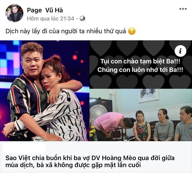 Vì tình hình dịch bệnh đang diễn biến vô cùng phức tạp nên gia đình không thể tổ chức đám tang cho bố vợ Hoàng Mèo. Ngay cả vợ của nam diễn viên là con ruột cũng không thể gặp mặt cha lần cuối. Dưới bài đăng của Vũ Hà, cư dân mạng bày tỏ sự xót xa, nói lời tiễn biệt với người đã khuất: