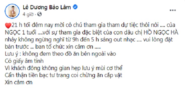 Mới đây, trên trang Facebook cá nhân, Lê Dương Bảo Lâm bất ngờ chia sẻ thông tin về bữa tiệc thôi nôi của con gái Bảo Nhi. Cụ thể, anh viết: “21 giờ tối đêm nay mời cô chú tham dự tiệc thôi nôi của Ngọc 1 tuổi với sự tham gia đặc biệt của con dâu chị Hồ Ngọc Hà nhảy không ngừng từ 21 giờ đến 5 giờ sáng hết nhạc. Vui lòng đặt bàn trước. Ban tổ chức xin cảm ơn”, nam diễn viên thông báo.
