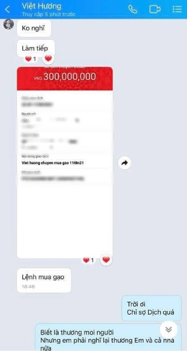 Sau sự việc này, Việt Hương từng tiết lộ 2 vợ chồng bị mất tinh thần, có ý định nghỉ làm từ thiện 1 thời gian. Tuy nhiên, mới đây, một người bạn của nữ danh hài tiết lộ việc bỏ ra 300 triệu đồng để mua gạo cho bà con người nghèo ở các khu đang bị phong tỏa. Trên trang cá nhân, Việt Hương cũng đăng tải lại đoạn video người dân vui mừng nhận cứu trợ kèm lời chú thích: “Chảy nước mắt. 15 ngày xong định nghỉ, thấy cảnh này, đi cùng bà con không nghỉ đâu, 1 túi gạo, 1 chai nước mắm, 1 cái bánh… Bà con ơi đợi em cỡ nào cũng đi chung! Thương lắm”.