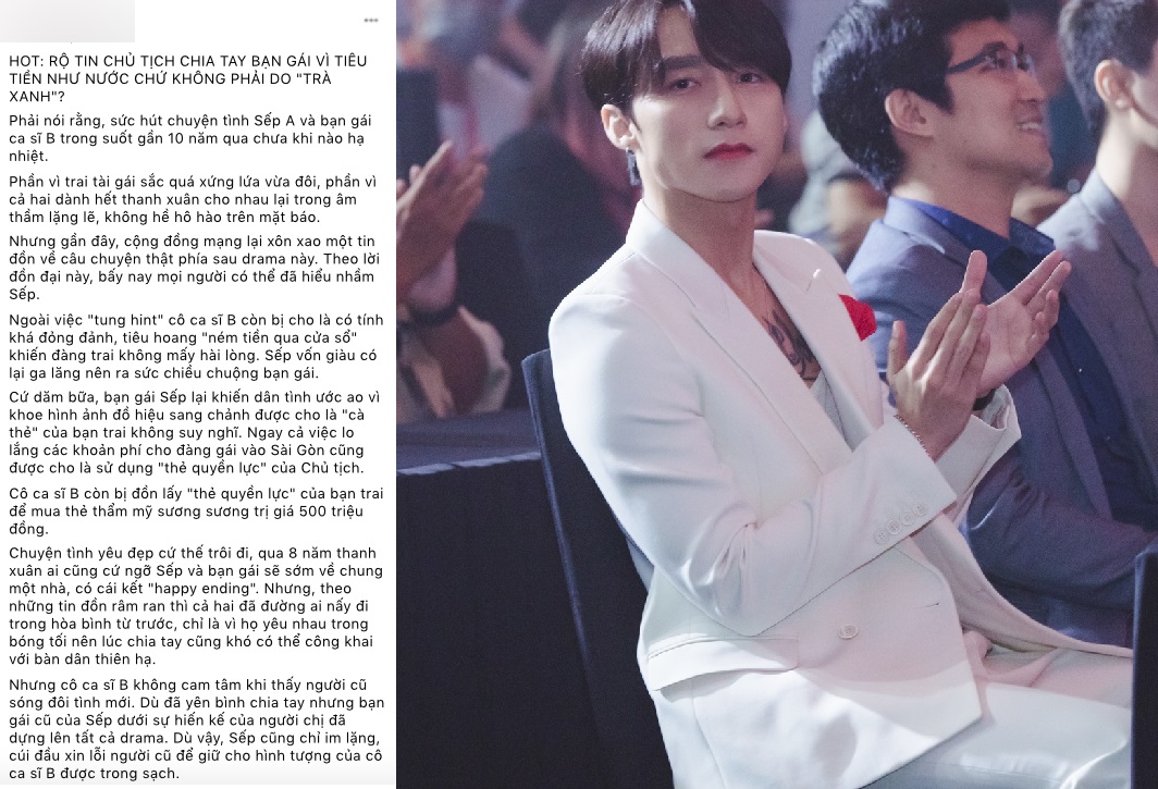 Nhiều ngày trước, MXH xôn xao trước một "kịch bản" nghi là tình tiết mới của drama trà xanh giữa Thiều Bảo Trâm - Sơn Tùng - MTP và Hải Tú. Theo đó, câu chuyện được lan truyền có nội dung "minh oan" cho nhân vật "trà xanh", cho rằng chuyện tình 8 năm của chủ tịch nọ với nữ ca sĩ xinh đẹp tan vỡ là vì nữ chính tiêu xài tiền của bạn trai như nước, bị gán cho mác là "đào mỏ".