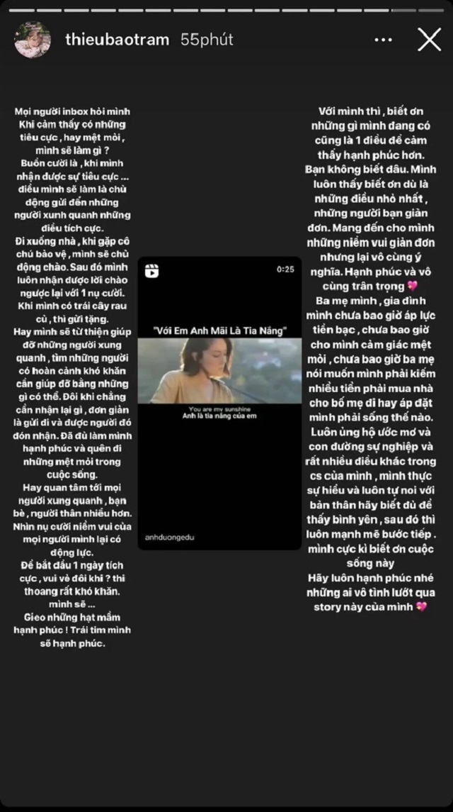 Theo đó,khi nhắc đến cách đối mặt với những vấn đề tiêu cực trong cuộc sống, Thiều Bảo Trâm thẳng thắn chia sẻ: "Ba mẹ mình, gia đình mình chưa bao giờ áp lực tiền bạc, chưa bao giờ cho mình cảm giác mệt mỏi, chưa bao giờ ba mẹ nói muốn mình phải kiếm nhiều tiền phải mua nhà cho bố mẹ hay đi áp đặt mình phải sống thế nào. Luôn ủng hộ ước mơ và con đường sự nghiệp và rất nhiều điều khác trong cuộc sống của mình, mình thực sự hiểu và luôn tự nói với bản thân hãy biết đủ để thấy bình yên, sau đó thì luôn mạnh mẽ bước tiếp. Mình cực kì biết ơn cuộc sống này".