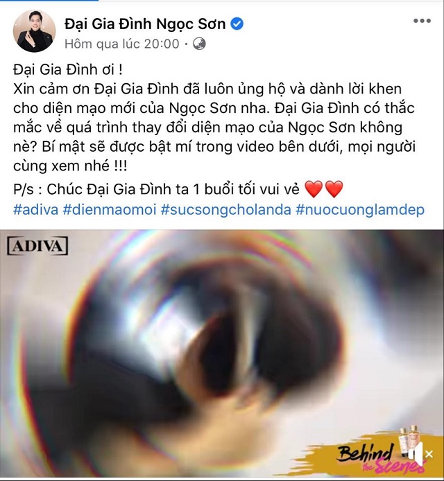 Mới đây, trên trang cá nhân, Ngọc Sơn khiến khán giả bất ngờ khi xuất hiện với diện mạo khác lạ. "Ông hoàng nhạc sến" chia sẻ clip kèm lời cảm ơn: "Đại Gia Đình ơi ! Xin cảm ơn Đại Gia Đình đã luôn ủng hộ và dành lời khen cho diện mạo mới của Ngọc Sơn nha".