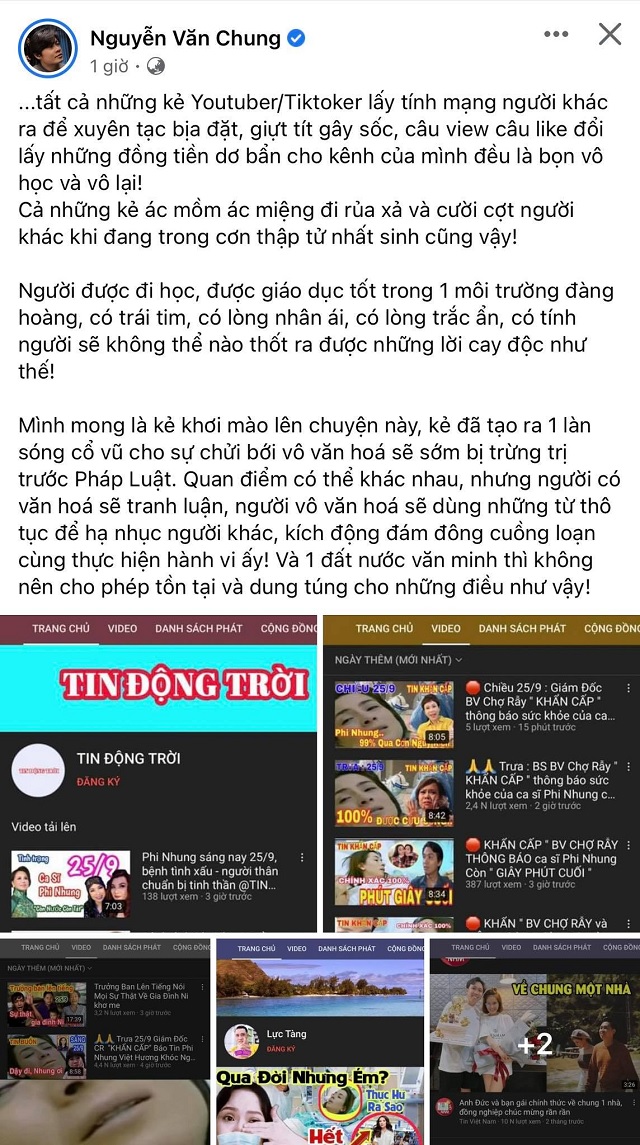 Mới đây, trên trang Facebook cá nhân, nhạc sĩ Nguyễn Văn Chung đã đăng tải dòng trạng thái gay gắt lên án kẻ lợi dụng tính mạng, sức khỏe của ca sĩ Phi Nhung để câu like, câu view bất chấp. Anh viết: