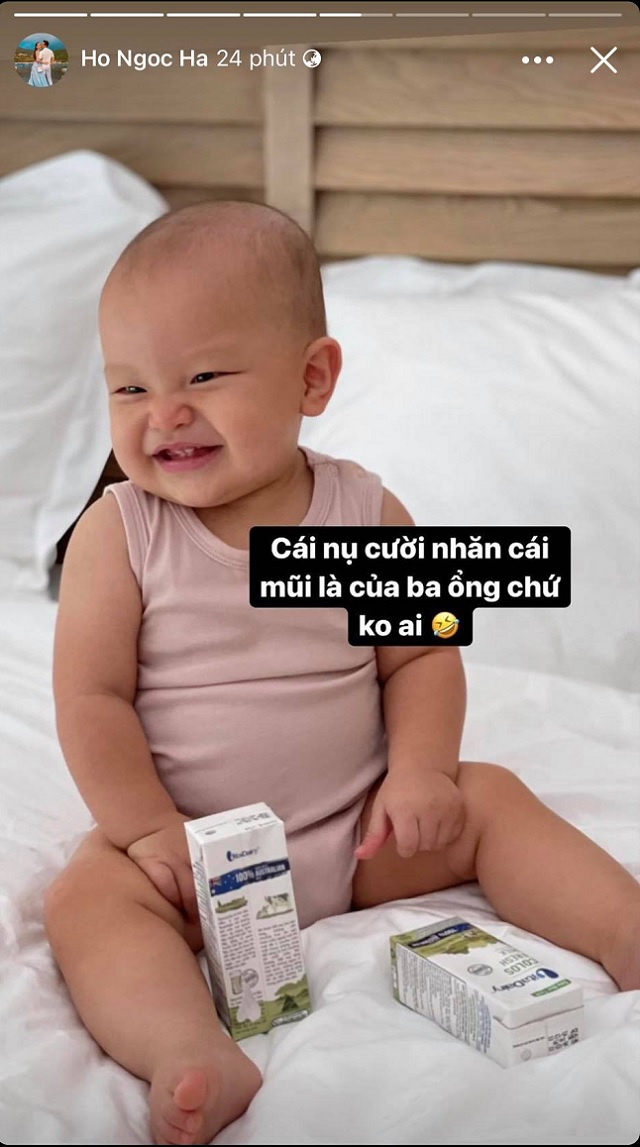 Mới đây, trên trang Facebook cá nhân, Hồ Ngọc Hà đăng tải lên story hình ảnh mới nhất của con trai út Leon kèm dòng caption: "Cái nụ cười nhăn cái mũi là của ba ổng chứ không ai".
