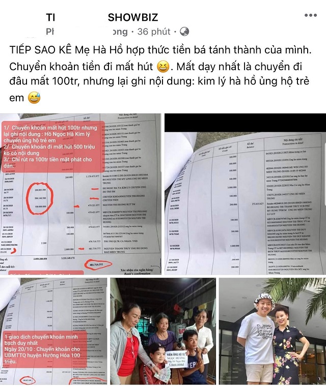 Mới đây, dân mạng bất ngờ phát hiện ra điểm lạ trong sao kê của mẹ ruột Hồ Ngọc Hà. Một bài đăng trong nhóm Facebook có hơn 300.000 thành viên đã đưa ra nghi vấn mẹ ruột "nữ hoàng giải trí' mượn danh con gái và con rể để hợp thức hóa số tiền hàng trăm triệu đồng.