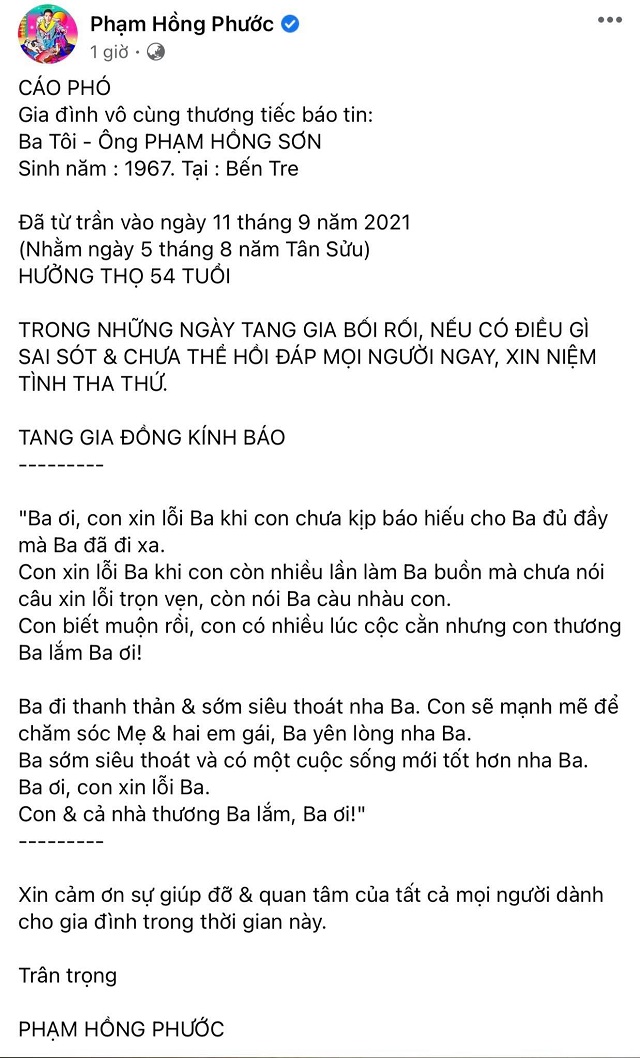 Mới đây, trên trang Facebook cá nhân, nam ca sĩ Phạm Hồng Phước chia sẻ dòng trạng thái dài thông báo việc bố ruột anh qua đời.